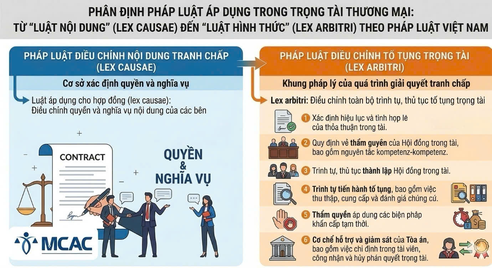 Bài viết trên đã phân tích chi tiết vấn đề "Phân định pháp luật áp dụng trong trọng tài thương mại: từ “luật nội dung” (lex causae) đến “luật hình thức” (lex arbitri) theo pháp luật việt nam ". Để biết thêm thông tin chi tiết hoặc cần hỗ trợ pháp lý, vui lòng liên hệ Ban thư ký MCAC: