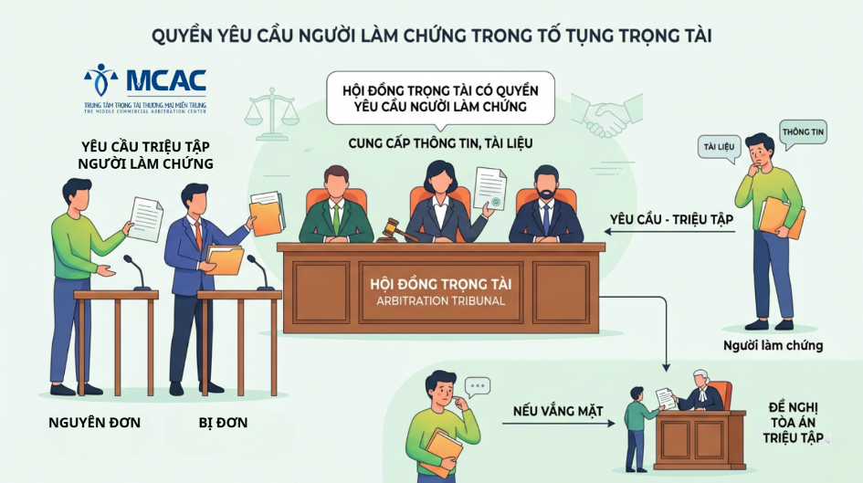 Pháp luật hiện hành, đặc biệt là Luật Trọng tài thương mại 2010, cùng với các quy tắc tố tụng của các Trung tâm trọng tài, trong đó có Trung tâm Trọng tài Thương mại Miền Trung (MCAC), đã thiết lập cơ chế pháp lý tương đối đầy đủ về quyền yêu cầu người làm chứng cung cấp thông tin, tài liệu, qua đó bảo đảm hiệu quả của quá trình tố tụng trọng tài.
