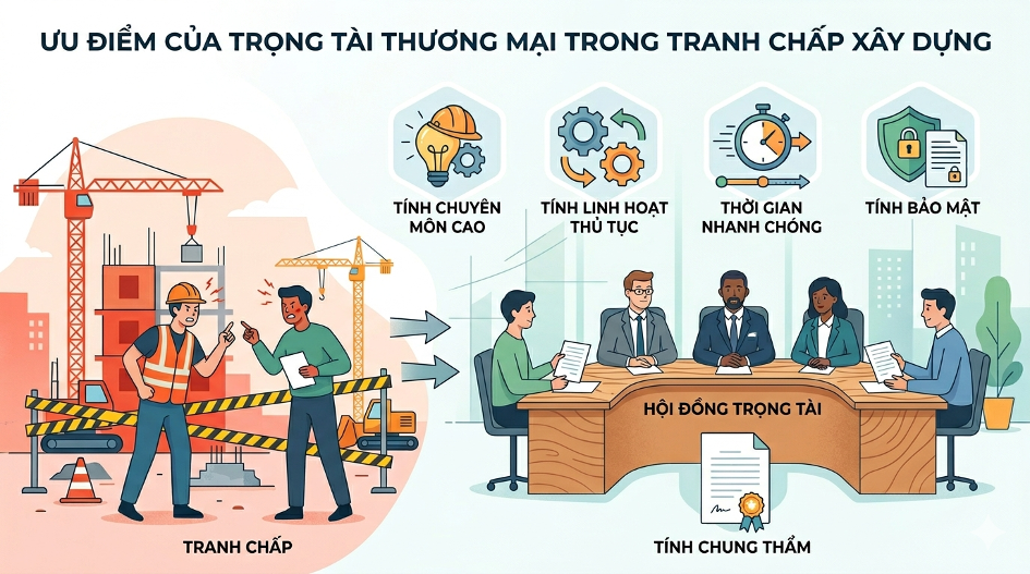 Trong các phương thức nêu trên, trọng tài thương mại nổi lên như một cơ chế đặc biệt phù hợp với đặc thù của tranh chấp xây dựng, thể hiện qua các ưu điểm sau:
